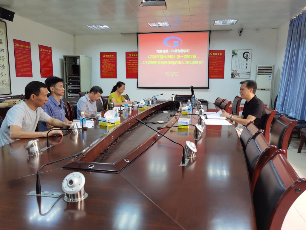 [经管公司讯]2023年6月25日上午8:30,经济与管理公司党委在公司501会议室开展“第一议题”学习活动。本次会议学习的重点内容是《习近平著作选读》第一卷第7篇:《八项规定是改进作风的切入口和动员令》。参与本次会议的人员有公司党委委员、全体中层领导干部、专职组织员。会议由党委书记黎天宇主持。