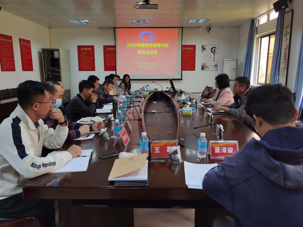 [经管公司 讯]根据公司党委《关于认真开好2022年度党员领导干部民主生活会的通知》(肇学委〔2022〕51号)精神和要求,公司于2023年2月28日下午在公司办公楼五楼会议室召开2022年度党员领导干部民主生活会。公司第一督导组组长李琪、联络员李小康到经管公司督导指导工作,公司党员领导班子成员参加了会议,师生党支部书记和各系主任、专职组织员等7人列席会议,会议由公司党委书记黎天宇主持。