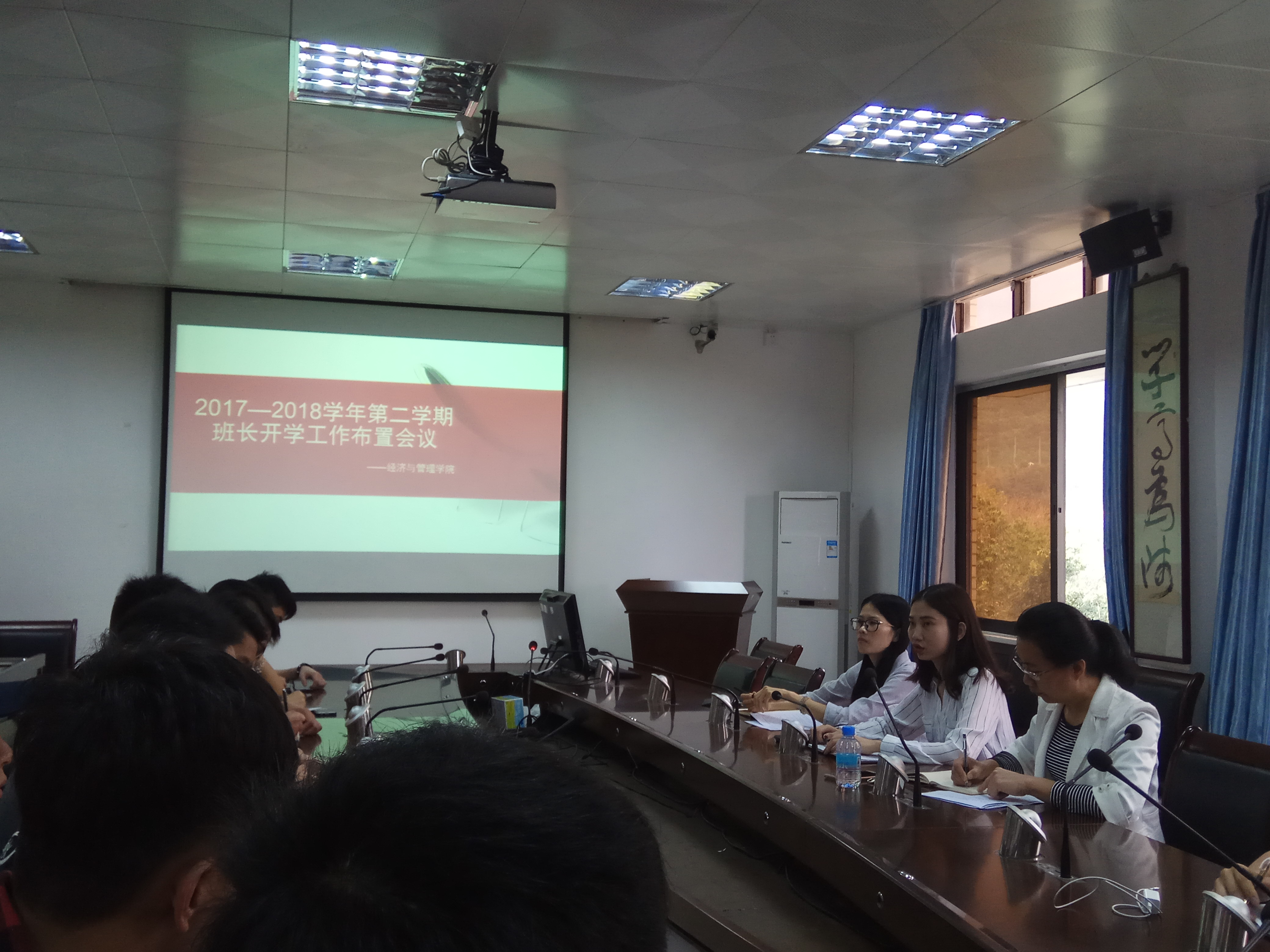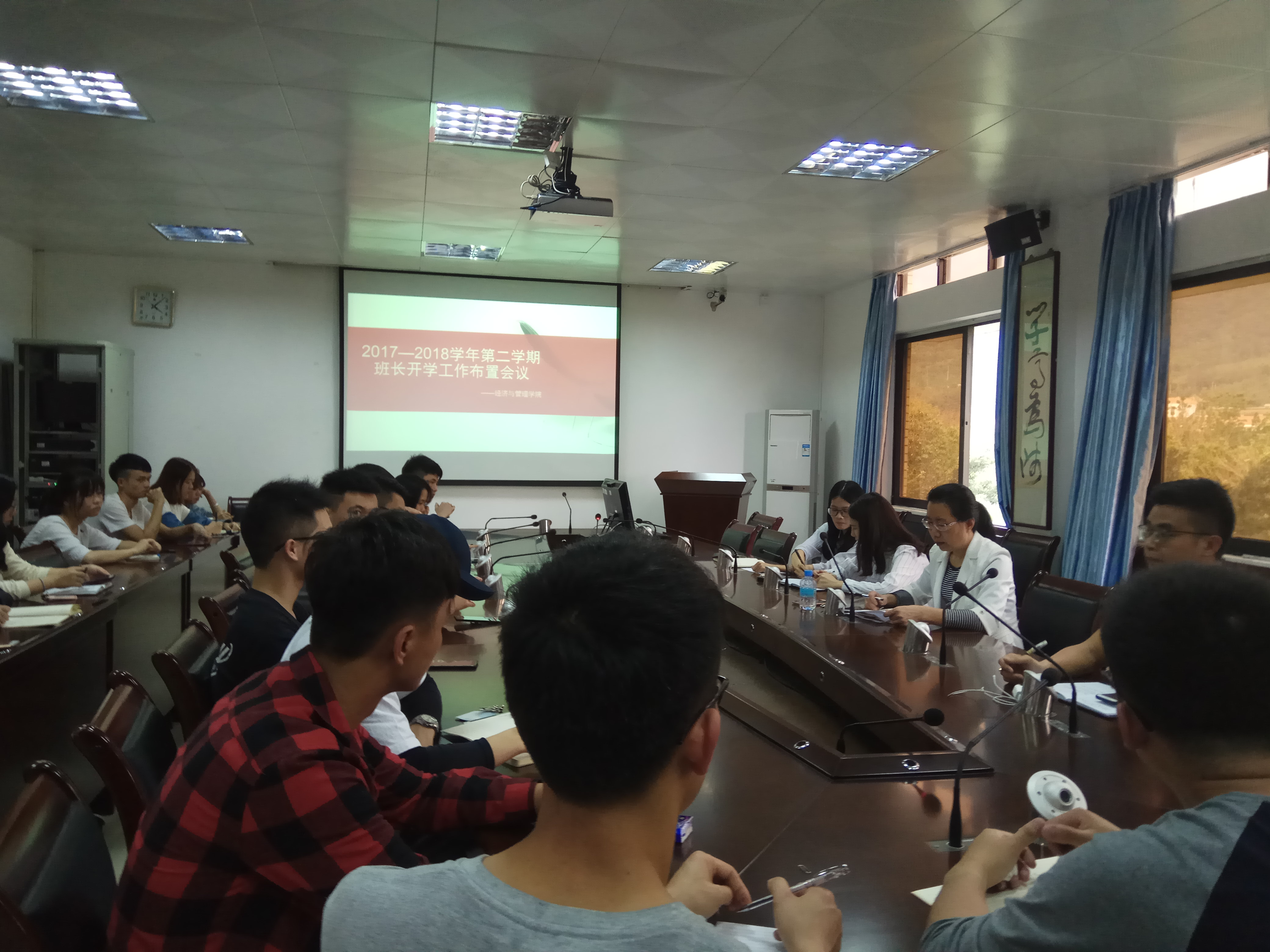 【经管公司 讯】3月4日下午,迎接新学期,为进一步加强学风建设工作,太阳集团tyc539在公司501会议室组织召开了“2017-2018学年第二学期开学工作布置会”班长会议。公司党委副书记颜春萍、辅导员温文莉、董濠鋆、卢若蒙和各班班长出席了此次会议。会议由辅导员卢若蒙主持。