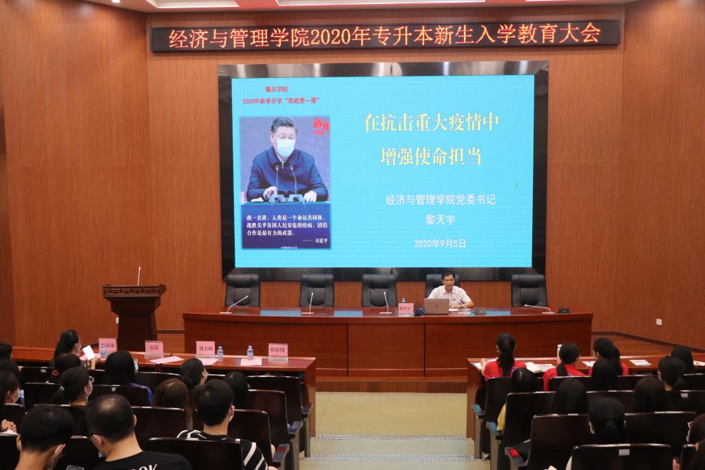 [经管公司 ]为做好专生本新生入学思想政治教育,贯彻落实习近平总书记关于新冠肺炎疫情防控工作的重要讲话和指示精神,公司党委精心备课,认真组织,扎实上好2020年秋季开学思政第一课。2020年9月2日,公司党委书记黎天宇为大家讲授了题为“在抗击重大疫情中增强使命担当”的思政课,公司党委副书记、辅导员、班主任及全体专插本新生共400多人参加了活动。