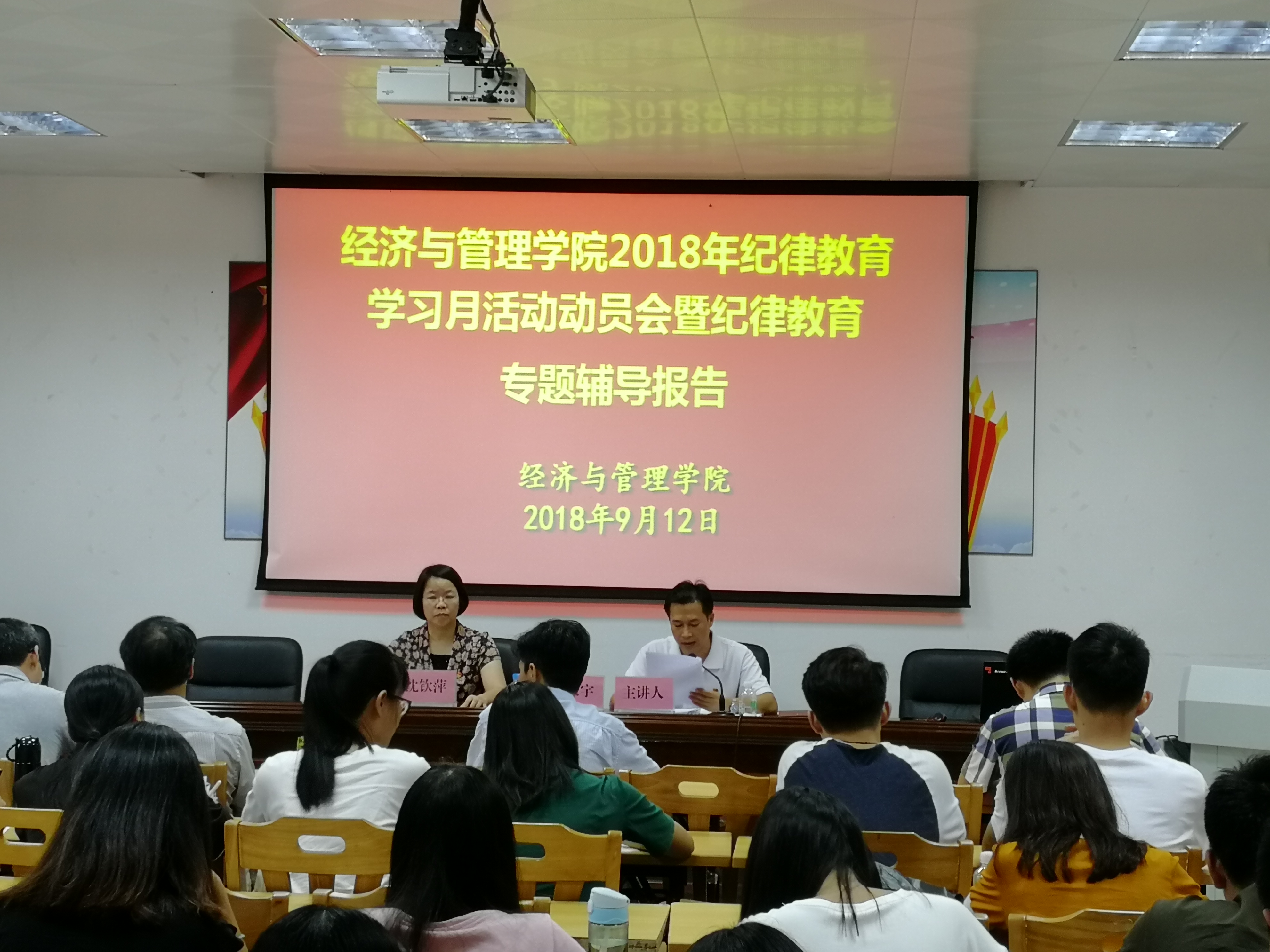 (本网讯)9月12日下午,公司党委在107党员活动室组织召开2018年纪律教育学习月活动动员大会,公司党委委员、机关党委书记沈钦萍同志参会指导和检查工作。公司党委书记黎天宇主持会议,公司全体教职工党员、员工正式党员60多人出席此次会议。