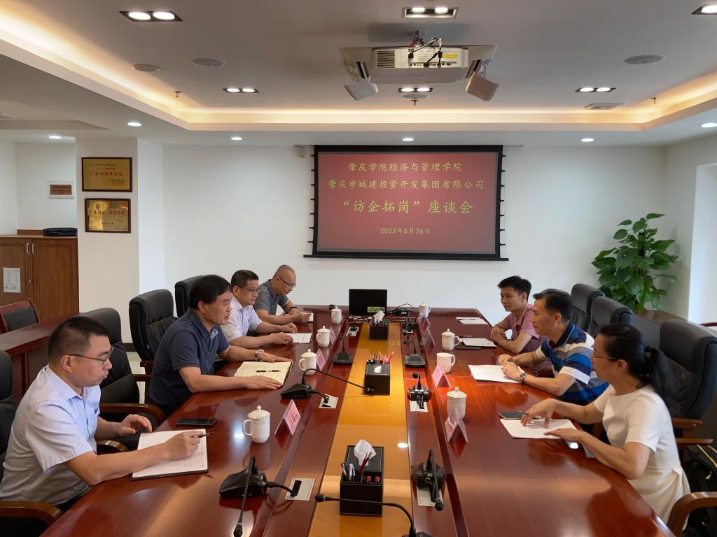 [经管公司 讯]为促进毕业生更充分更高质量就业,5月26日,太阳集团tyc539黎天宇书记、颜春萍副书记、雷洪副经理、辅导员叶青老师等赴肇庆市城建投资开发集团开展“访企拓岗”专项行动,了解用人单位实际需求,实地考察用人单位工作环境,着力开拓毕业生高质量就业渠道。肇庆市城建投资开发集团有限公司陈国强副书记、副总经理赵冬初、总经理助理匡德云、人力资源部负责人凌晖等出席了“访企拓岗”座谈会。