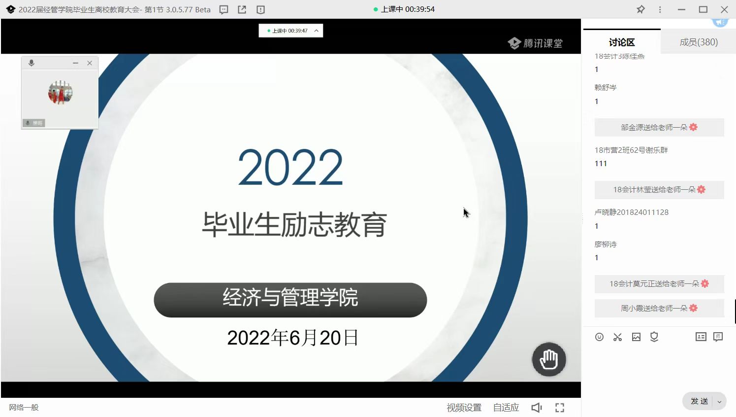 6月20日,太阳集团tyc539利用腾讯课堂平台,以“云会议”的形式举行2022届毕业生离校教育大会,公司领导、辅导员老师、全体2022届毕业生参与。