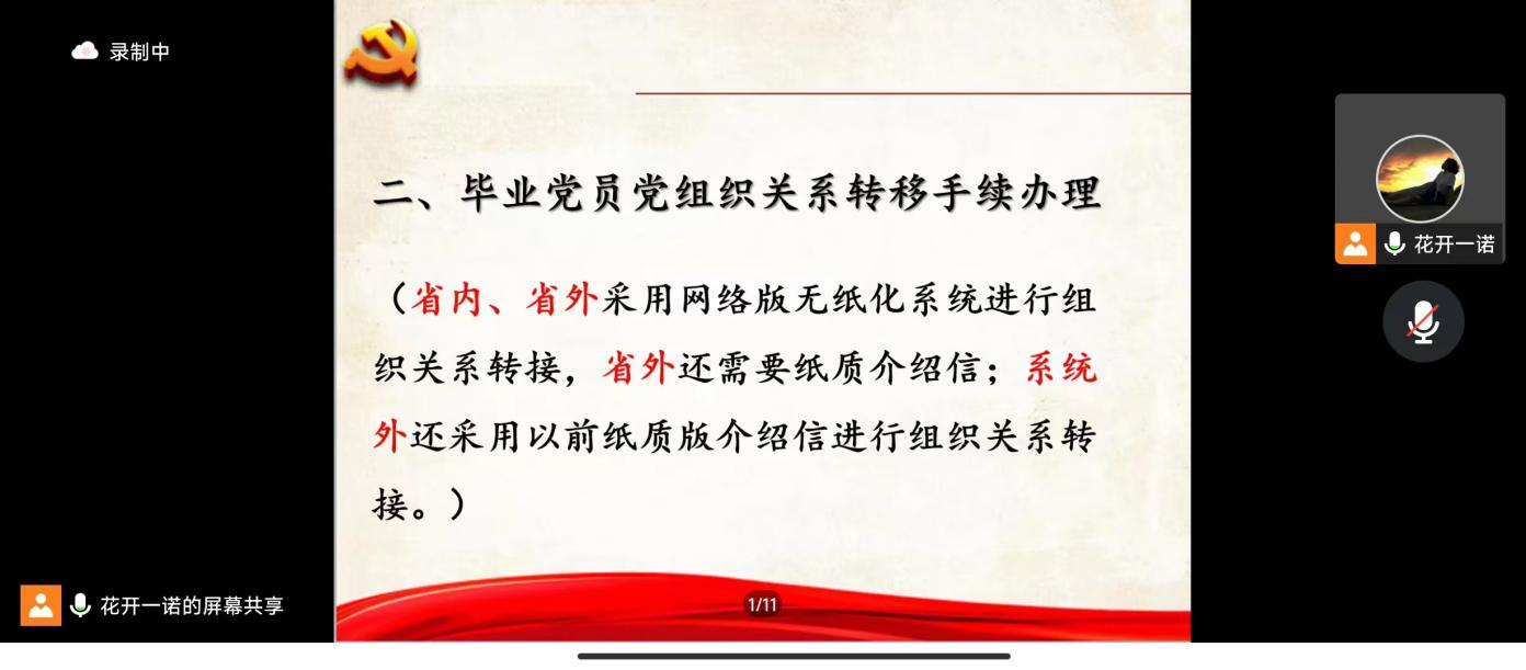 首先,王老师为大家详细讲解了毕业生党员组织关系转接的主要流程和注意事项,提醒毕业生党员要重视党组织关系转接工作,做到及时沟通、及时反馈,确保高效完成组织关系转接事宜。同时,王老师针对毕业生们提出的疑惑进行了细致解答。最后,王老师对毕业生党员们提出三点希望:一是牢记党员身份,不忘初心,不断前行;二是不断加强理论学习,增强党性修养;三是要做实干家和行动者,在未来的工作学习中不断做出新成绩,贡献新力量,展现新作为,继续发挥党员的先锋模范作用。