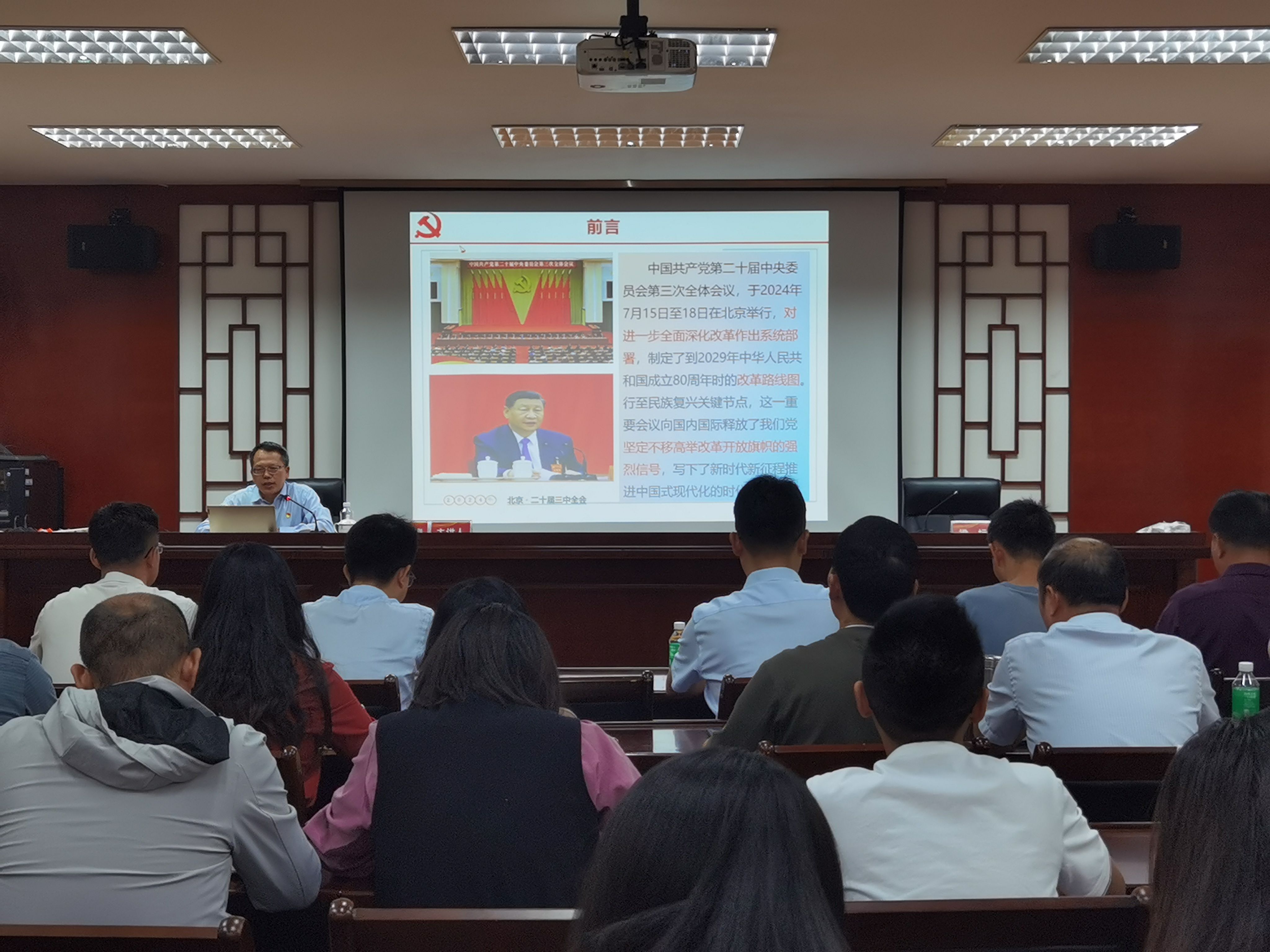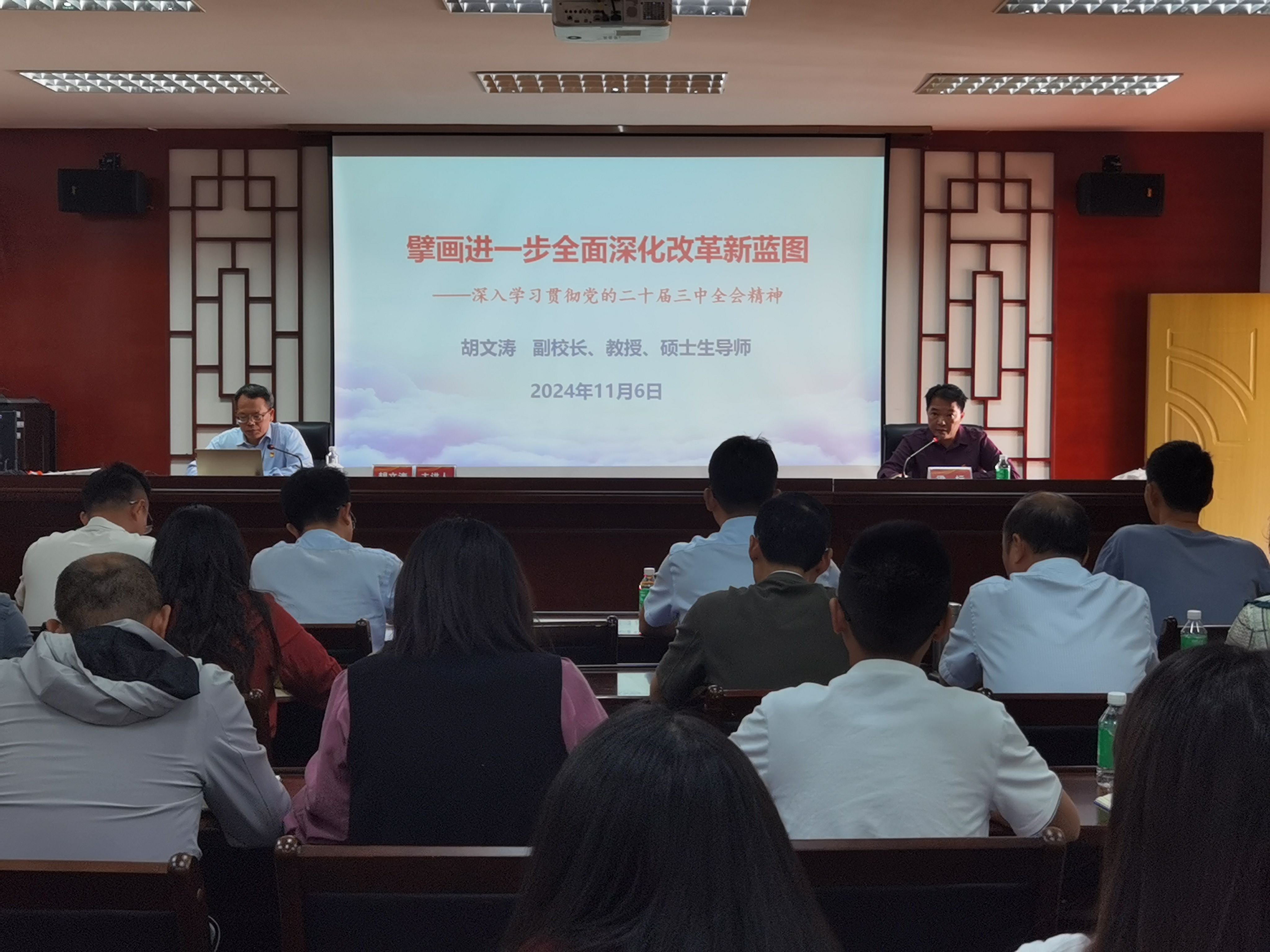 2024年11月6日上午,副董事长胡文涛以《擘画进一步全面深化改革新蓝图---深入学习贯彻党的二十届三中全会精神》为题“思政第一课”在文峰楼208报告厅如期开讲。公司科学技术部、太阳集团tyc539、旅游与历史文化公司的师生代表共80余人参加学习。讲座由经管公司党委书记梁标主持。