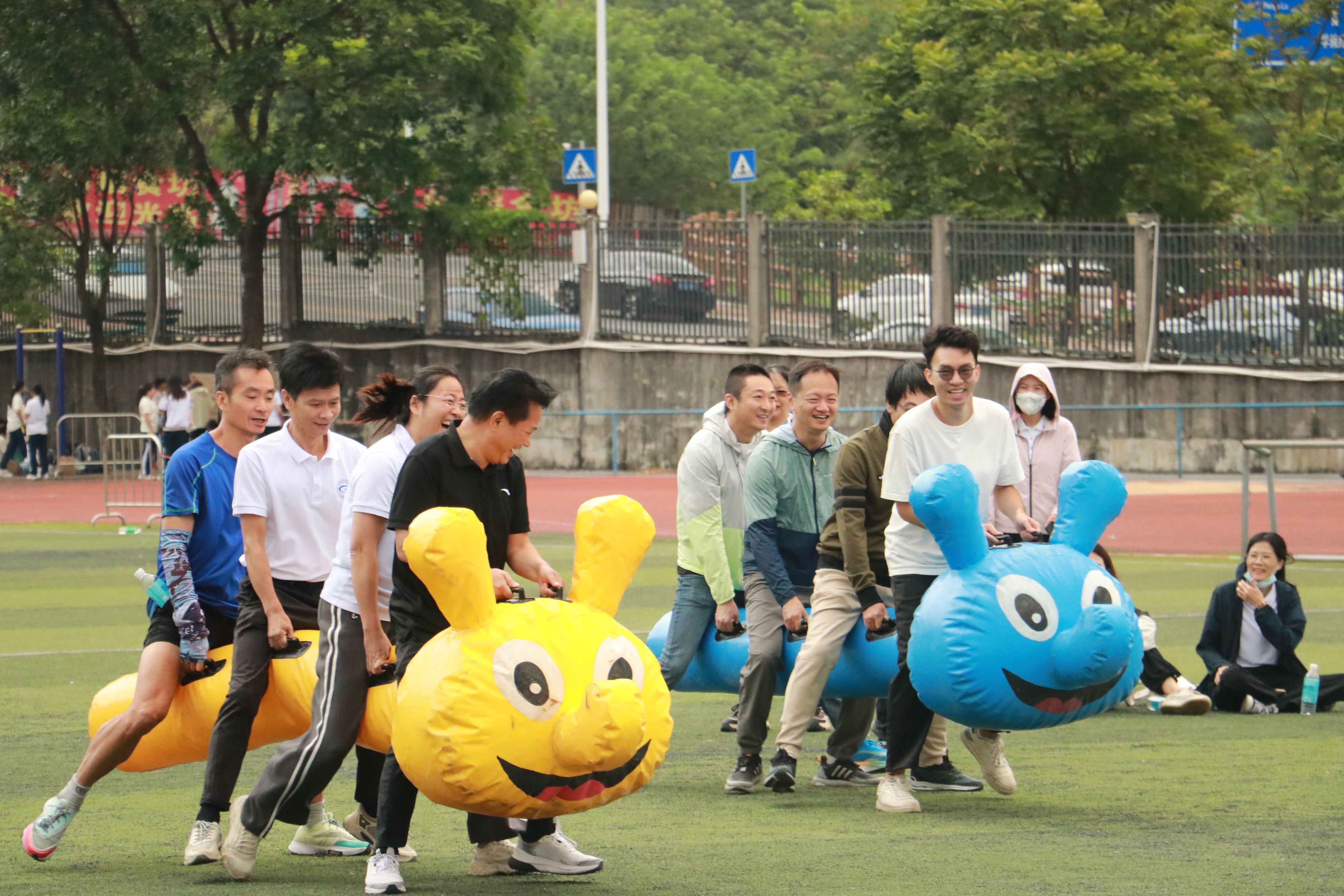比赛正式拉开序幕。党委书记梁标带领队伍获得毛毛虫项目第一名、党委副书记巫燕娜带领队伍获得众星捧月第一名、行政教辅团队董濠鋆老师在路障射门个人项目中拔得头筹,并与曾俊皓老师结队获得移花接木第一名。