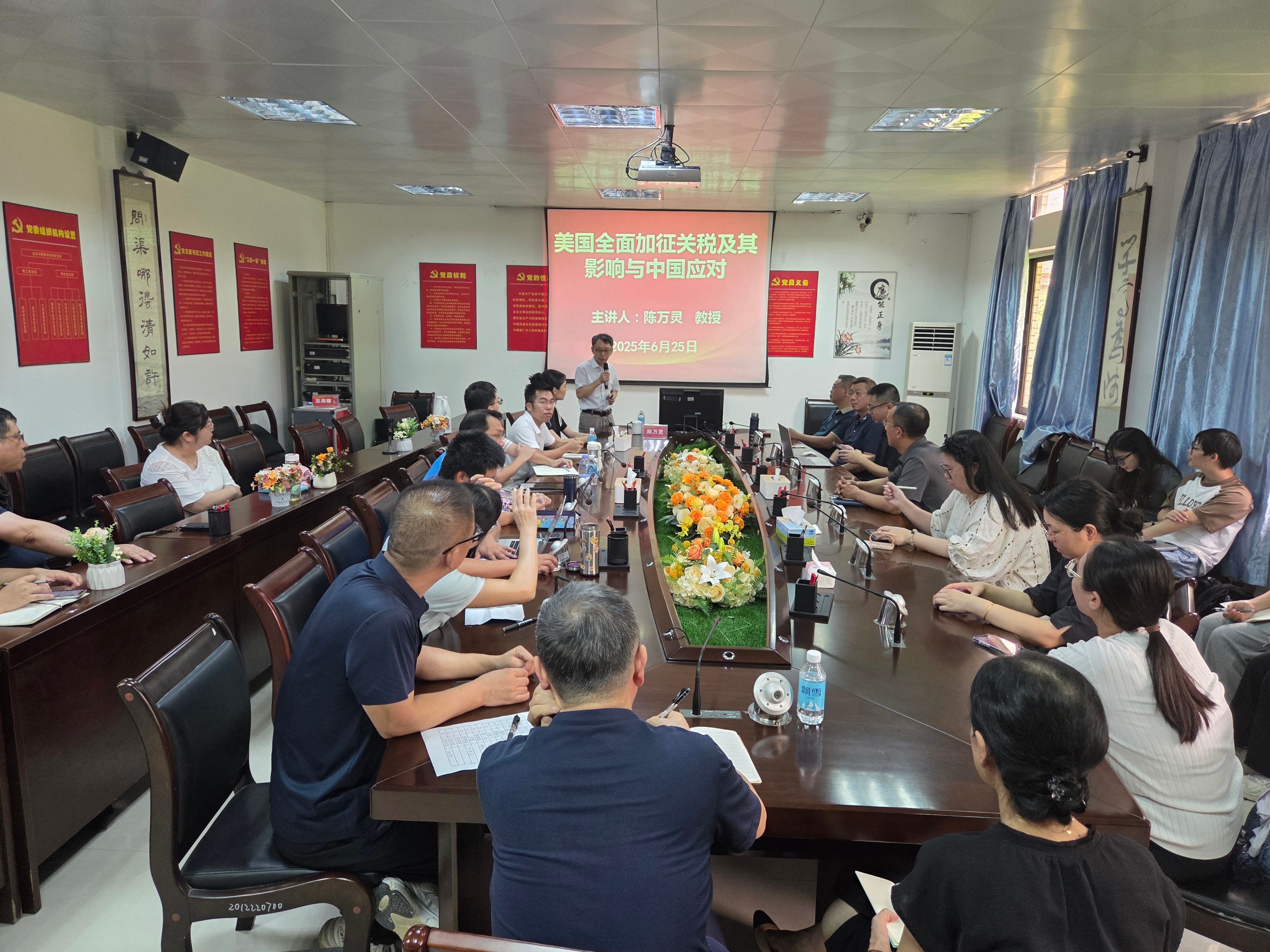 6月25日,太阳集团tyc539成功举办“砚园经管名师名家论坛”第八讲,特邀广东外语外贸大学国际经济贸易研究院陈万灵教授做主题为“美国全面加征关税及其影响与中国应对”的专题讲座。本次讲座由公司经理李华军主持,公司师生积极参会,现场气氛热烈。