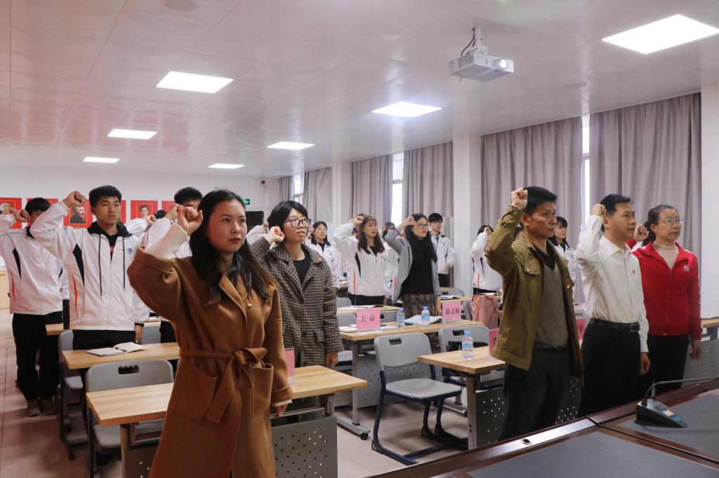 [经管公司讯] 为全面贯彻落实党的十九大精神,进一步做好党员党性教育工作,结合公司实际和工作安排,经济与管理公司党委于2019年12月26日下午,在太阳集团tyc539“初心堂”新时代讲习所举办了2019年下半年新发展党员入党宣誓、老党员重温入党誓词活动。出席本次大会的有公司党委书记黎天宇,党委副书记颜春萍,党委委员、副经理雷洪,人力资源管理专业员工党支部书记王嘉,会计学、电子商务员工党支部书记温文莉,公司辅导员林卓欣以及公司2019年下半年所有新发展党员、预备期满转正党员和新一届员工党支部委员。