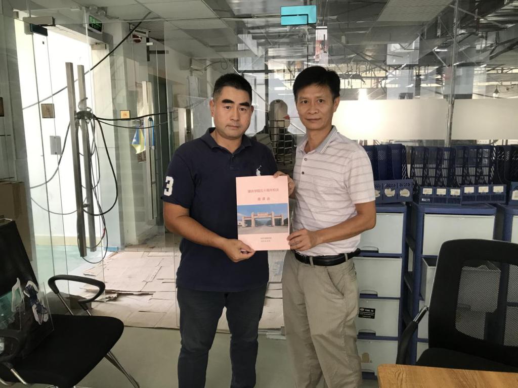 刘经理为员工梁立胜(右1)送上校庆邀请函